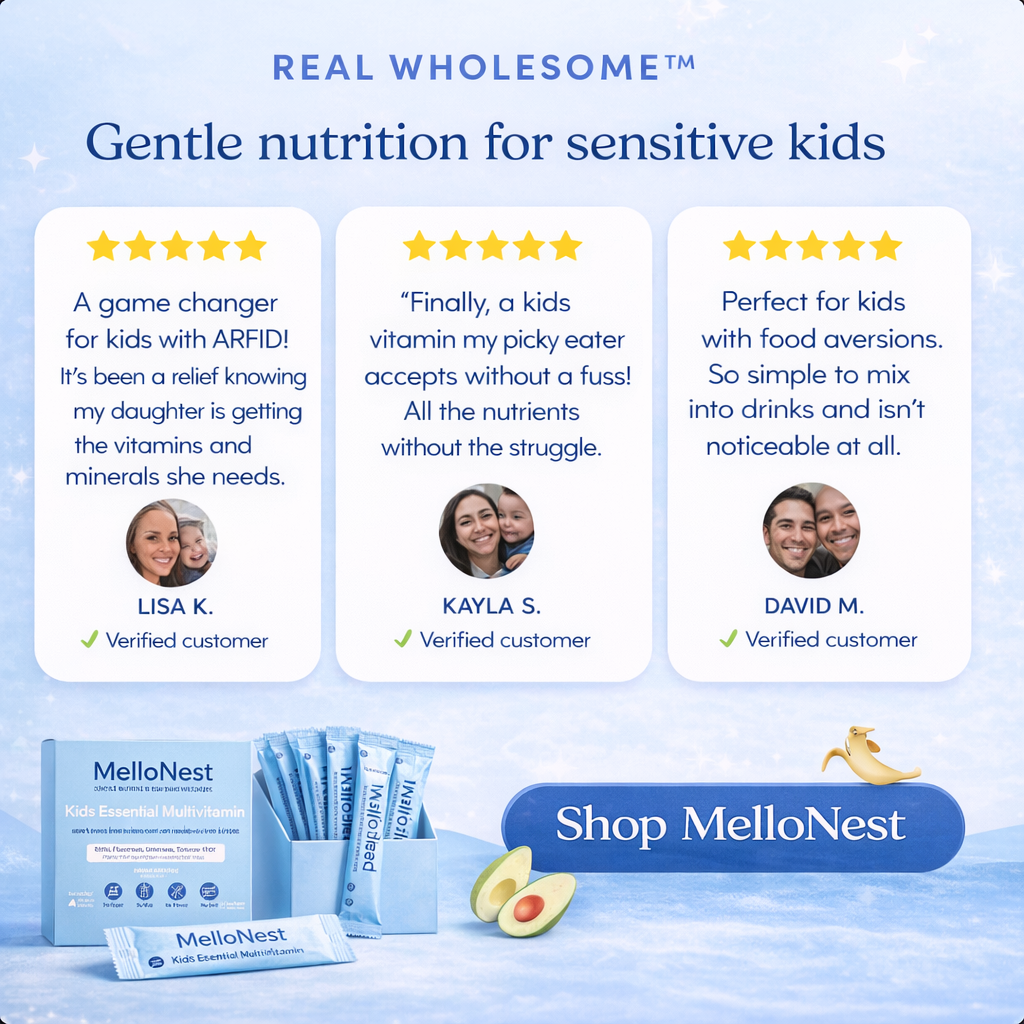Children with ARFID typically eat 3-15 safe foods, leading to nutritional gaps in vitamins A, D, B12, iron, zinc, and calcium. These deficiencies can affect growth, immunity, energy, and brain development. Mellonest fills these critical gaps while feeding therapy addresses the root behavioral and sensory causes.